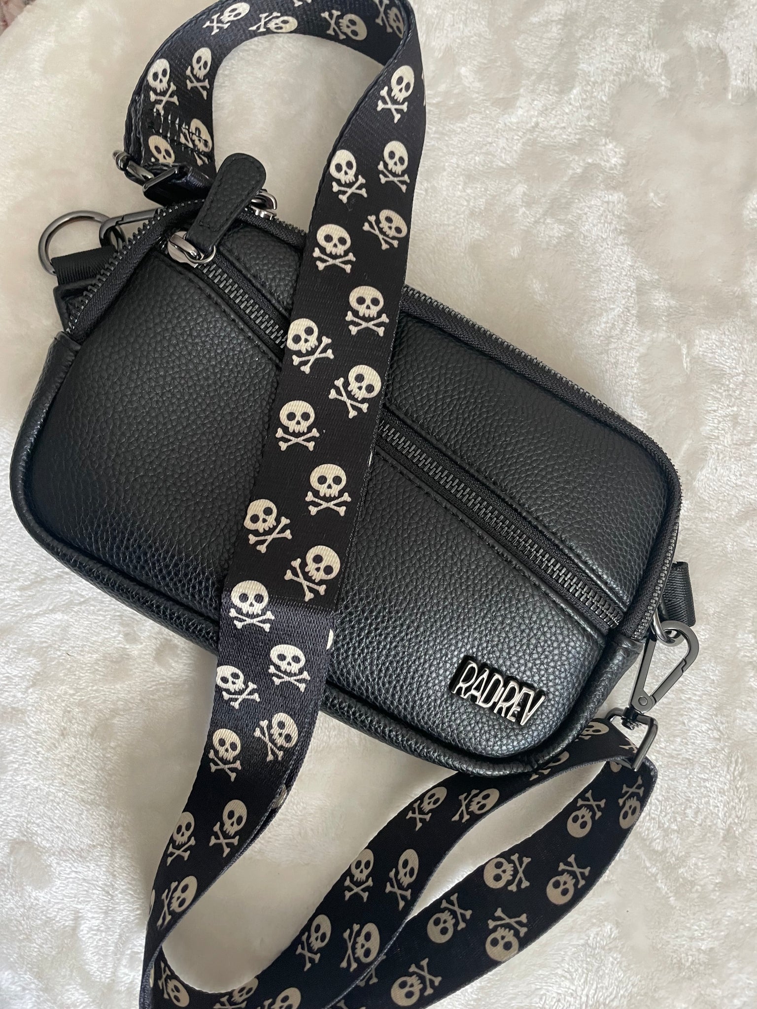 This bag strap comes in gunmetal hardware. Is 1.5 inches wide and adjusts to about 60 inches at longest point.