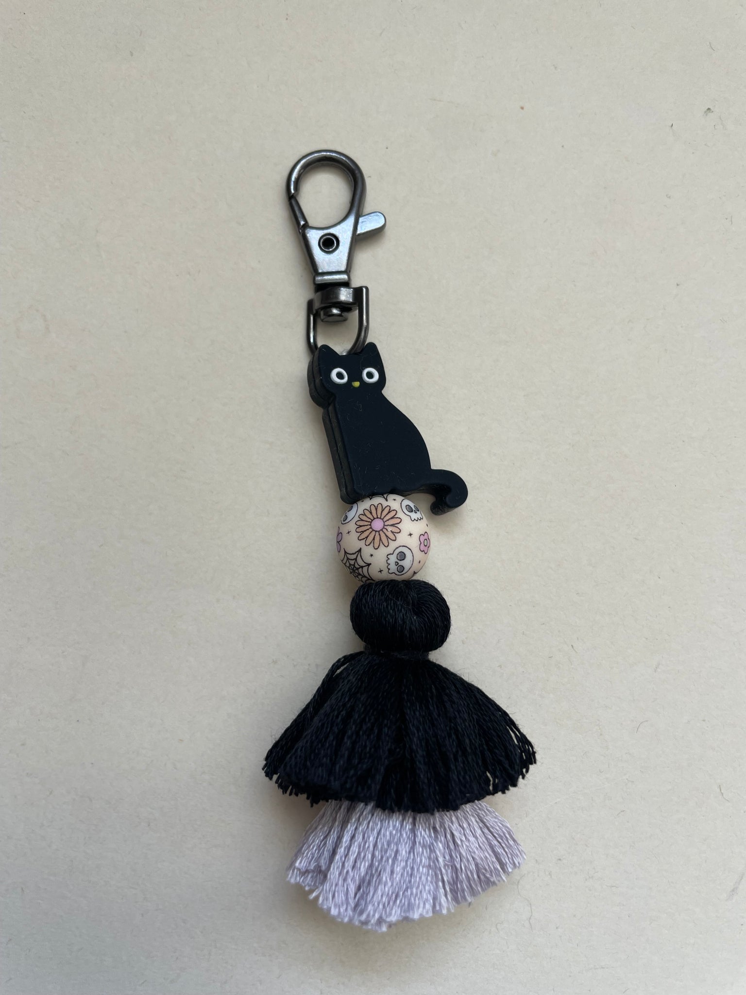 This tassel is made with gunmetal hardware. The cat is reversible one side is skeleton one side isn’t