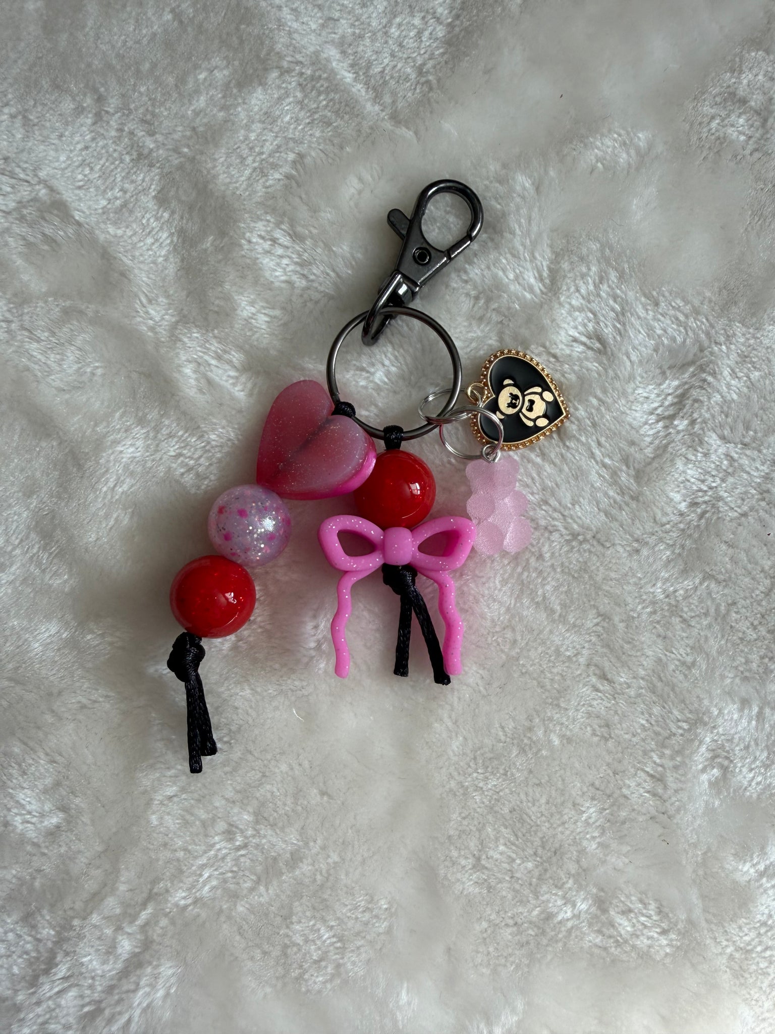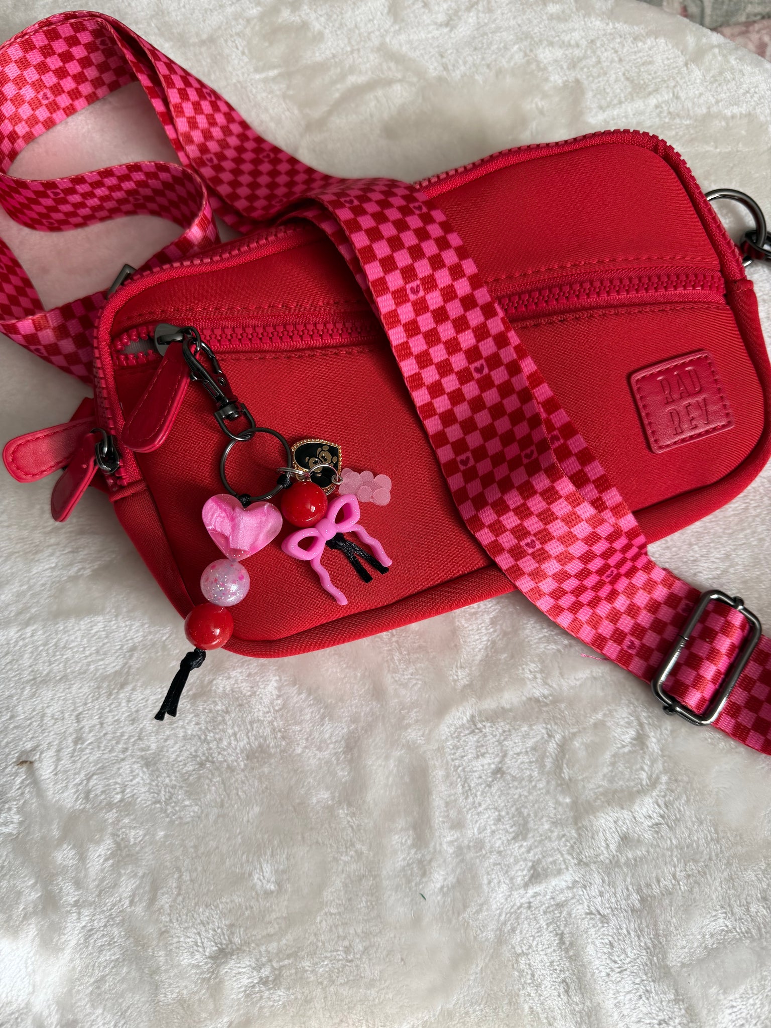 Made with gunmetal hardware. Our chunky heart keychain looks really cute with out checker heart bag strap