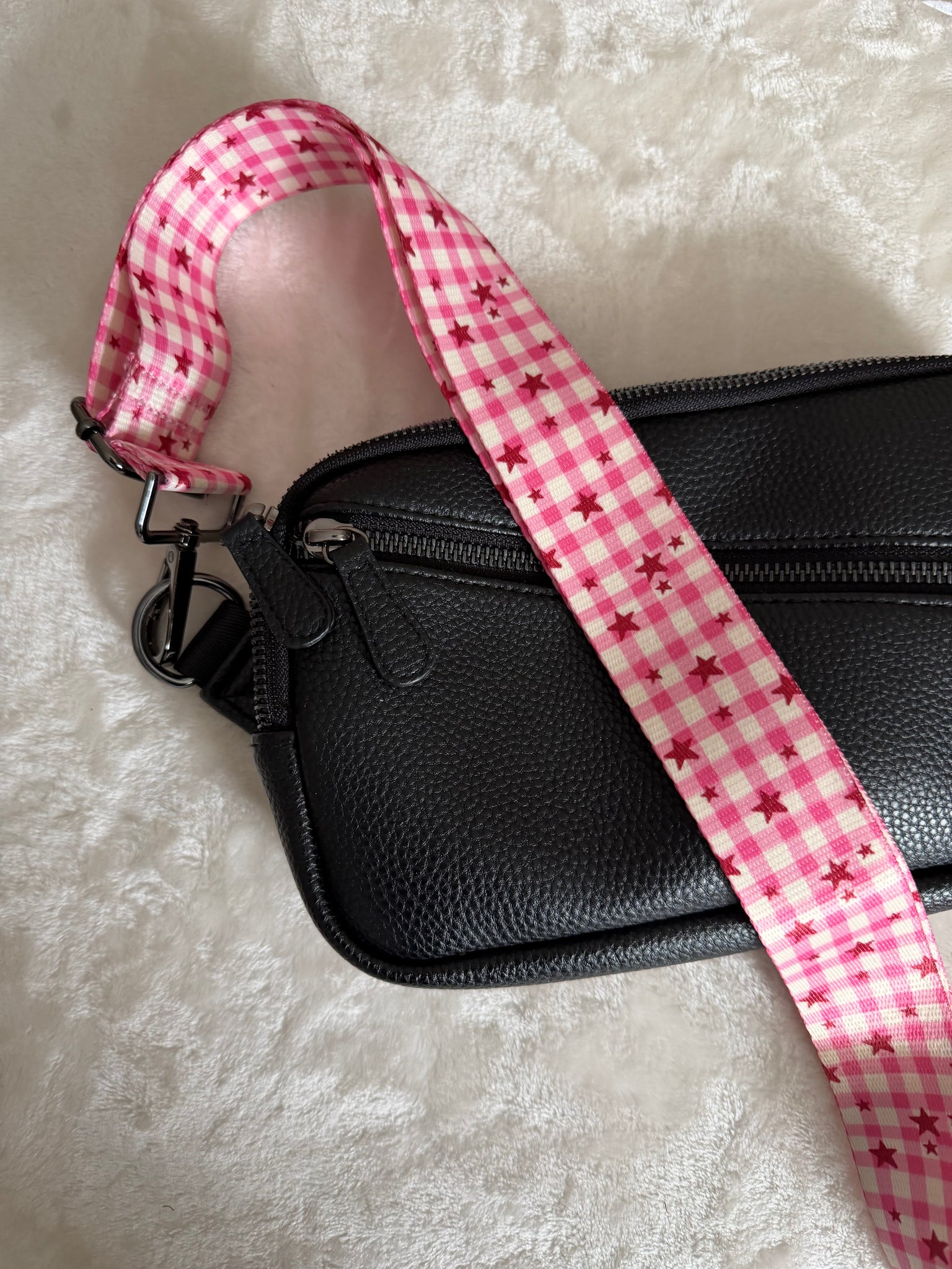 This ba strap is so cute! A perfect valentines strap! It is pink gingham with dark maroon stars.