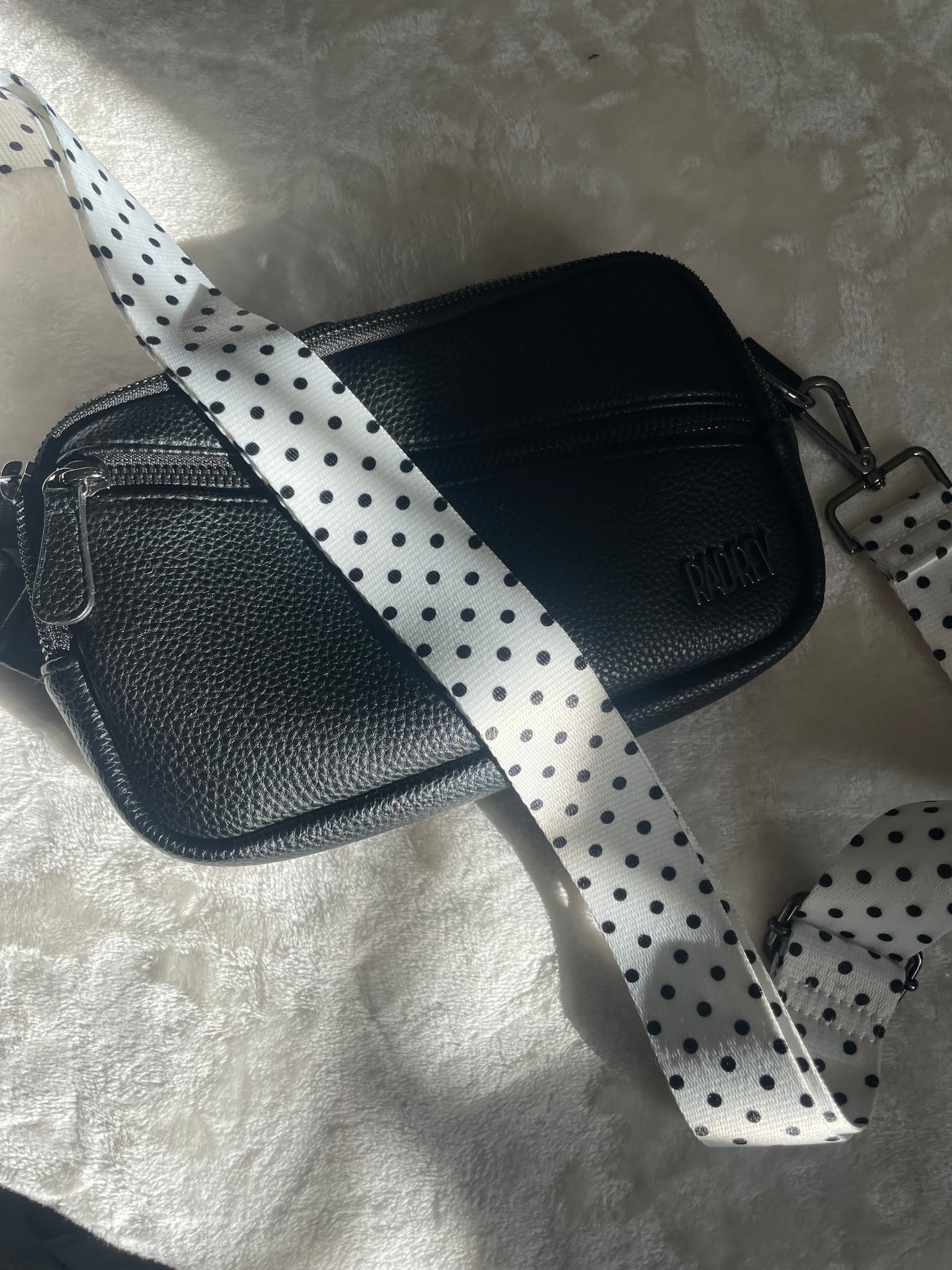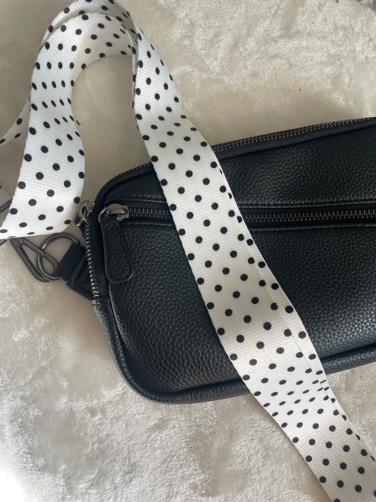 our white and black polka dot bag strap comes in gold and gunmetal hardware. A perfect neutral bag strap. Can also easily be styled for any season!
